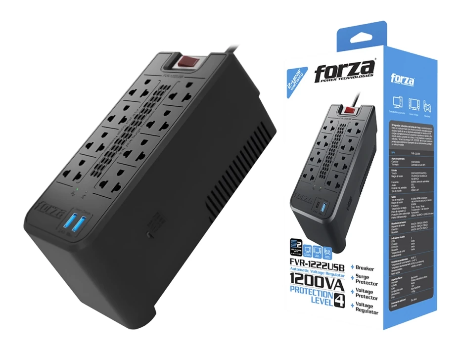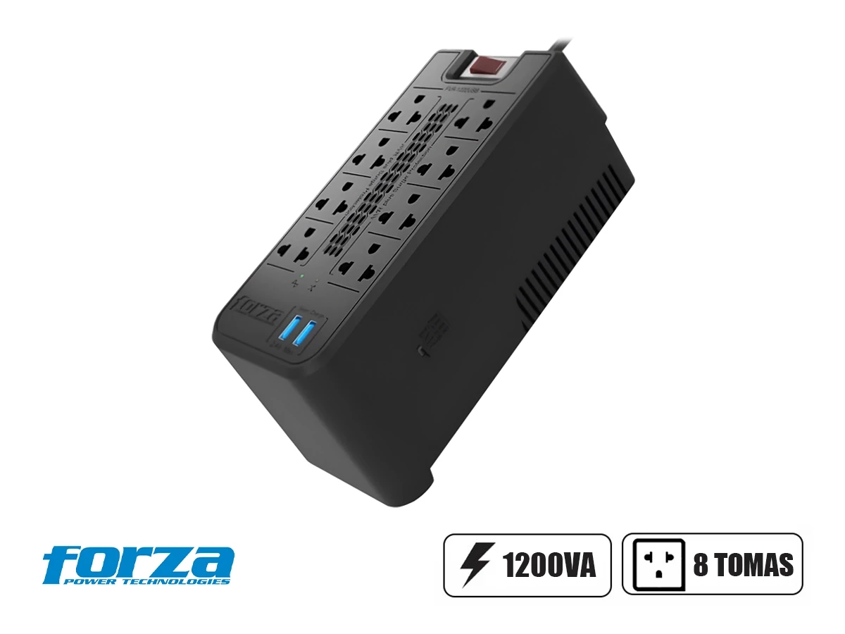 Estabilizador Forza 1200va 8 Tomas Y 2 Puerto Usb, Capacidad 1200va / 600w, Entrada Nema 5 -15p, Indicador De Luz Led, Color Negro (fvr-1222usb)