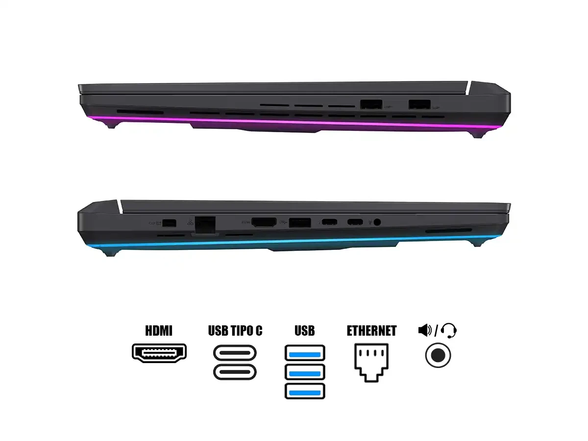 | Puertos : | x1 Thunderbolt 4, x1 USB 3.2 Gen2 Type C, x3 USB 3.2 Gen2, x1 HDMI, x1 RJ-45, x1 Jack combo audio |