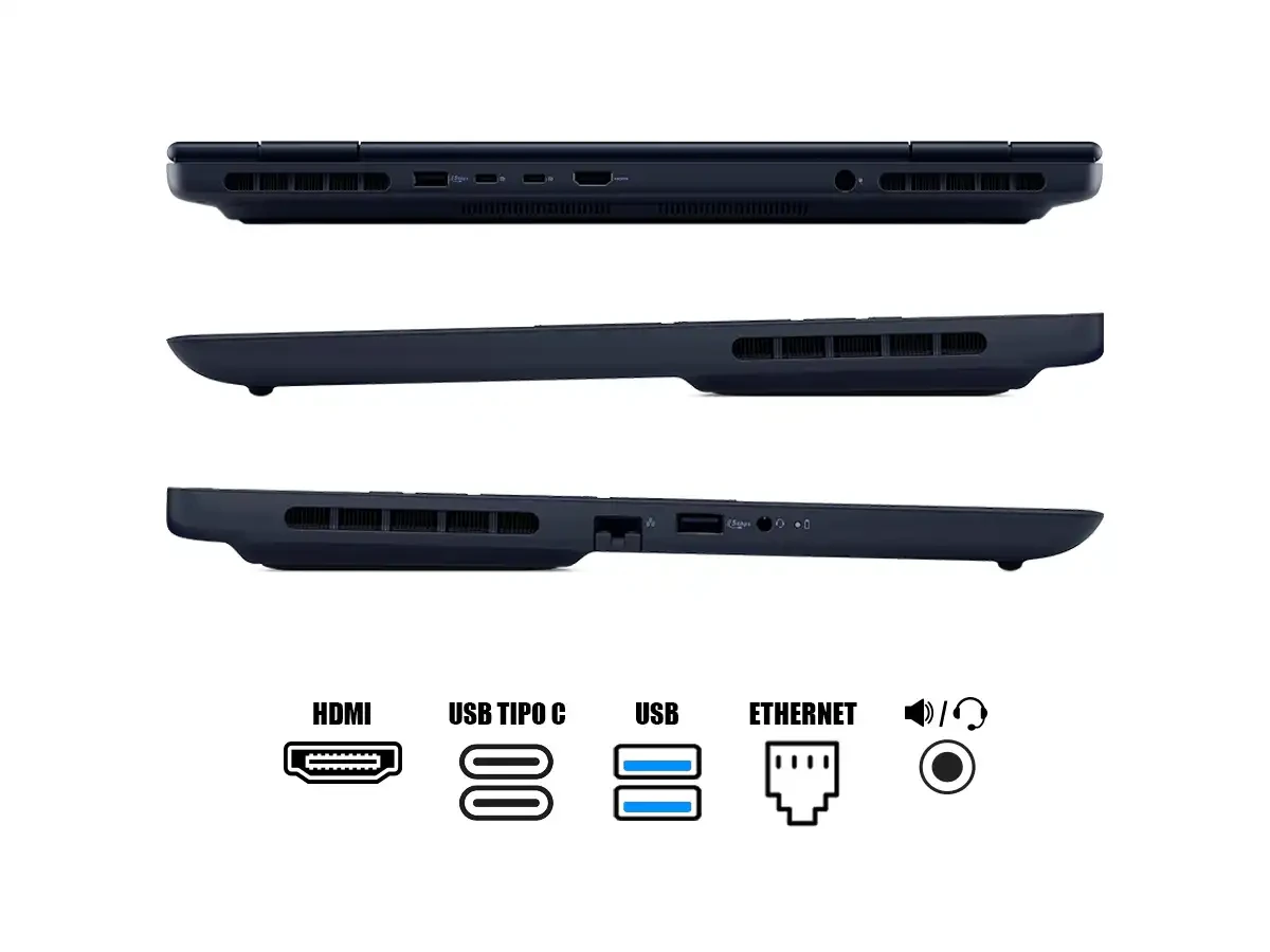 | Puertos | x2 USB 3.2 Gen2 Type C, x2 USB 3.2 Gen1, x1 HDMI, x1 RJ-45, x1 Jack combo audio | x1 Thunderbolt 4, x3 USB 3.2 Gen1, x1 HDMI 2.1, x1 mini DP 1.4, x1 RJ-45, x1 Lector SD, x1 Jack combo audio | x1 Thunderbolt 4, x1 USB 3.2 Gen2 Type C, x3 USB 3.2 Gen2, x1 HDMI, x1 RJ-45, x1 Jack combo audio | x1 Thunderbolt 4, x1 USB 3.2 Gen2 Type C, x3 USB 3.2 Gen2, x1 HDMI, x1 Jack combo audio |
