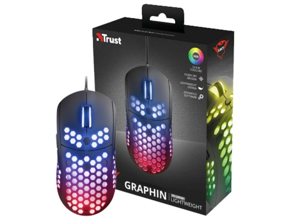 Mouse Trust Gxt960 Graphin Ultra Light Gaming, Sensor Hasta 10,000 Dpi, Iluminacion Rgb, Con 6 Botones, Conexion Usb, Color Negro (8713439237580)